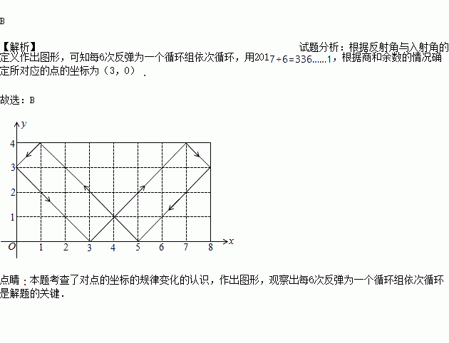 如图,动点P从(0,3)出发,沿所示方向运动,每当碰到矩形的边时反弹,反弹时反射角等于入射角,当点P第2017次碰到矩形的边时,此时点P的坐标为( )