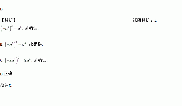 A. (﹣a3)2=a5 B. (﹣a3)2=﹣a6 C. (﹣3a2)2=6a4 D. (﹣3a2)2=9a4