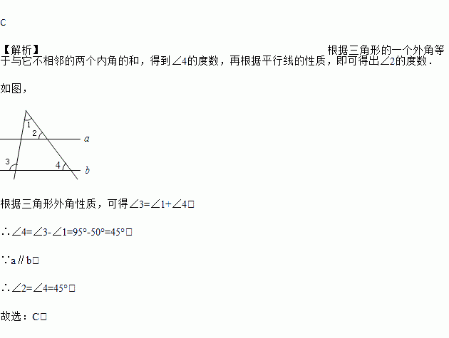 如图,直线a∥b,若∠1=50°,∠3=95°,则∠2的度数为( )