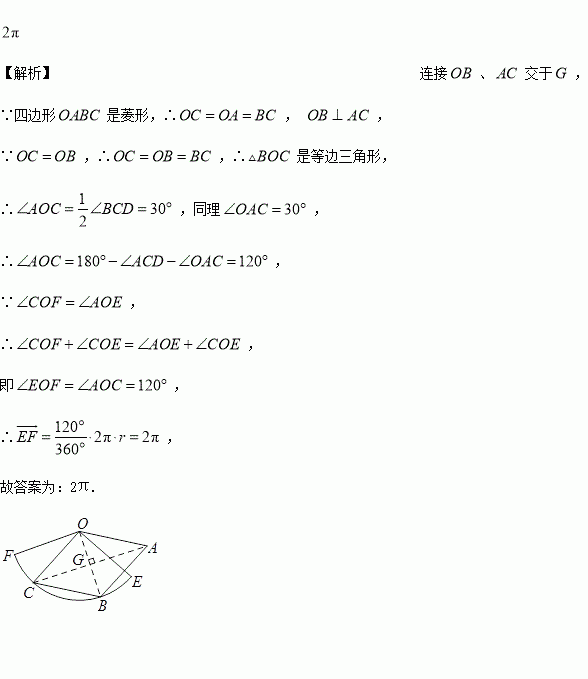如图,四边形为菱形,点在以点为圆心、以为半径的上,若, ,则的长度为__________.(结果保留)