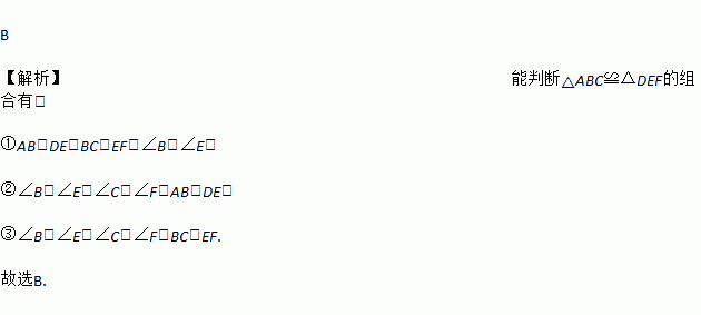 B 【解析】能判断△ABC≌△DEF的组合有: ①AB=DE,BC=EF,∠B=∠E; ②∠B=∠E,∠C=∠F,AB=DE; ③∠B=∠E,∠C=∠F,BC=EF. 故选B.