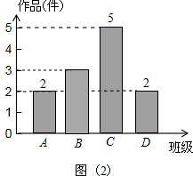 分析 (1)由题意可求得李老师所调查的4个班征集到作品共:5÷$\frac{150}{360}$=12(件),B班征集到作品:12-2-5-2=3(件);继而可补全条形统计图;