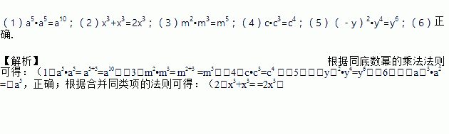 (1)a5•a5=2a5_____; (2)x3+x3=x6_____; (3)m2•m3=m6_____;