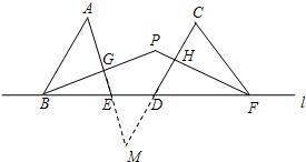 (2)如图2,B、E、D、F从左至右顺次排列,△ABE与△CDF均为锐角三角形,∠ABD=α°(0<α<90),求∠GPH;
