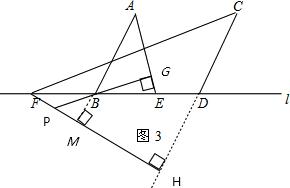 (3)如图3,F、B、E、D从左至右顺次排列,△ABE为锐角三角形,△CDF为钝角三角形,则∠GPH的度数为多少?请画出图形并直接写出结果,不需证明.