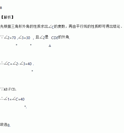 (2018•孝感一模)如图,AB∥CD,点E在线段BC上,若∠2=70°,∠3=30°,则∠1的度数是( )