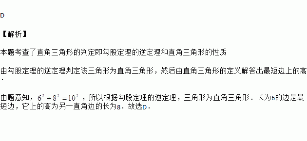 三角形的三边长分别为6,8,10,它的最短边上的高为( )