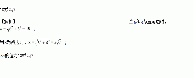 若直角三角形三边长分别为6cm,8cm和Xcm,则X=_________.