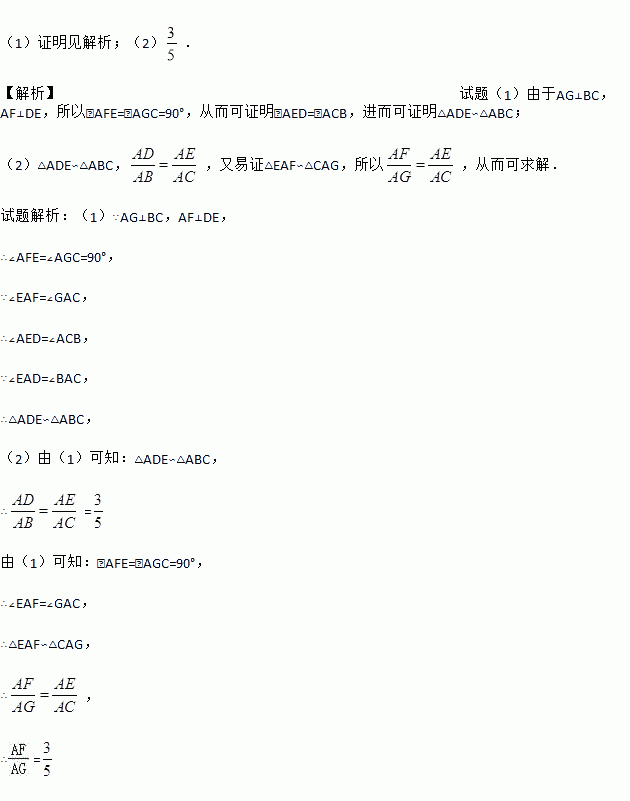 (2017浙江省杭州市)如图,在锐角三角形ABC中,点D,E分别在边AC,AB上,AG⊥BC于点G,AF⊥DE于点F,∠EAF=∠GAC.