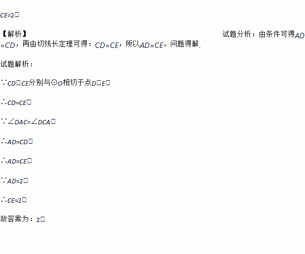 如图,AB为⊙O的直径,点C在AB的延长线上,CD、CE分别与⊙O相切于点D、E,若AD=2,∠DAC=∠DCA,求CE.
