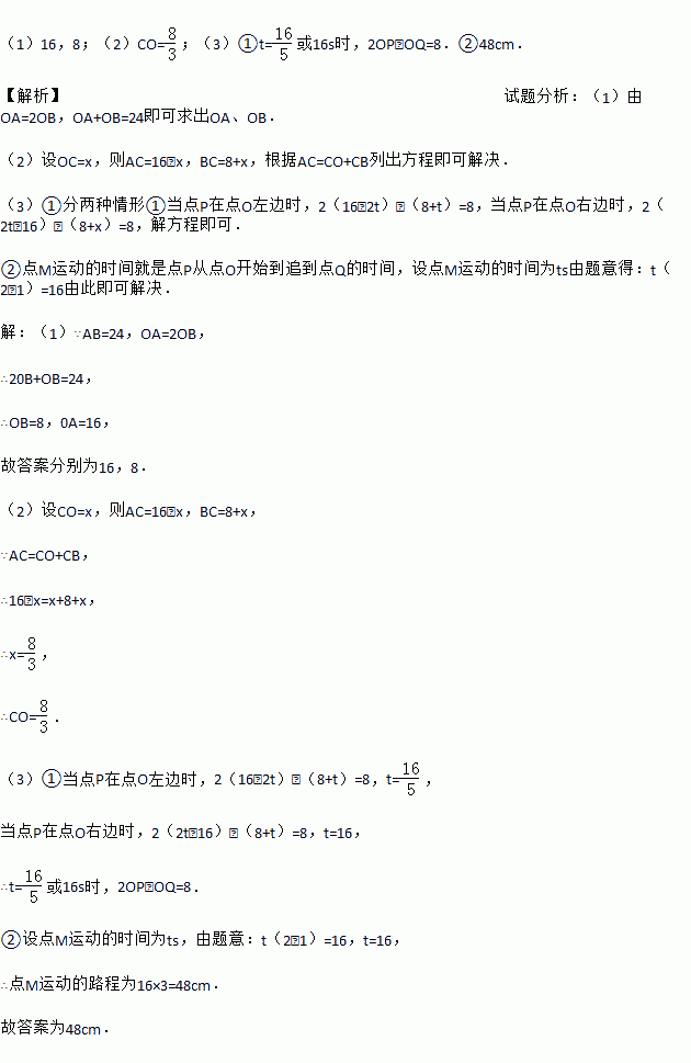 ②当点P经过点O时,动点M从点O出发,以3cm/s的速度也向右运动.当点M追上点Q后立即返回,以同样的速度向点P运动,遇到点P后立即返回,又以同样的速度向点Q运动,如此往返,直到点P、Q停止时,点M也停止运动.在此过程中,点M行驶的总路程为 cm.