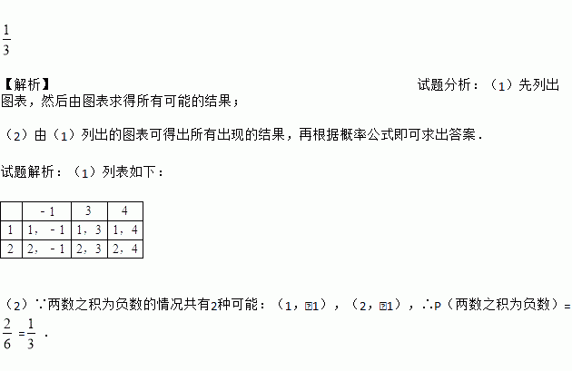 小明玩抽卡片和旋转盘游戏,有两张正面分别标有数字1,2的不透明卡片,背面完全相同;转盘被平均分成3个相等的扇形,并分别标有数字﹣1,3,4(如图所示),小明把卡片背面朝上洗匀后从中随机抽出一张,记下卡片上的数字;然后转动转盘,转盘停止后,记下指针所在区域内的数字(若指针在分格线上,则重转一次,直到指针指向某一区域内为止).