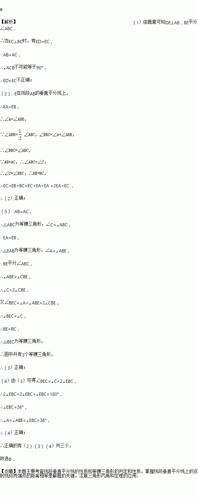如图,AB=AC,AB的垂直平分线交AB于D,交AC于E,BE恰好平分△ABC,有以下结论:(1)ED=EC;(2)△BEC的周长等与2AE+EC;(3)图中共有3个等腰三角形;(4)∠A=36°,其中正确的共有( )