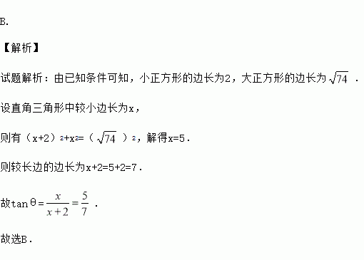 四个全等的直角三角形围成一个大正方形,中间空出的部分是一个小正方形,这样就组成了一个“赵爽弦图”(如图).如果小正方形面积为4,大正方形面积为74,直角三角形中较小的锐角为θ,那么tanθ的值是( )