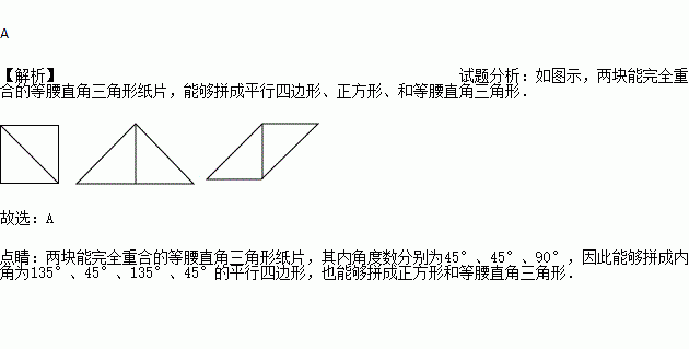 将两块能完全重合的两张等腰直角三角形纸片拼成下列图形:①平行四边形(不包括菱形、矩形、正方形)②矩形③正方形④等边三角形⑤等腰直角三角形( )