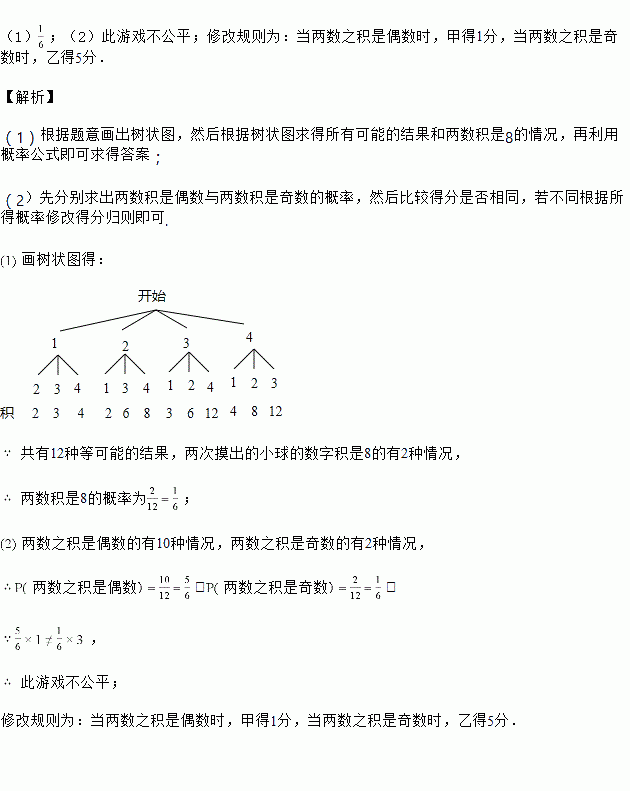 请用画树状图或列表的方法,求两数积是8的概率;![]()