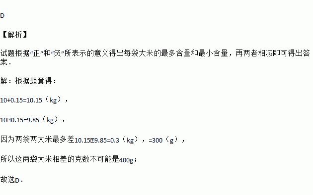 某大米包装袋上标注着“净含量10 kg±150 g”,小华从商店买了2袋大米,这两袋大米相差的克数不可能是( )
