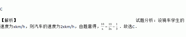 九年级学生去距学校10 km的博物馆参观,一部分学生骑自行车先走,过了20 min后,其余学生乘汽车出发,结果他们同时到达.已知汽车的速度是骑车学生速度的2倍,求骑车学生的速度.设骑车学生的速度为x km/h,则所列方程正确的是( )