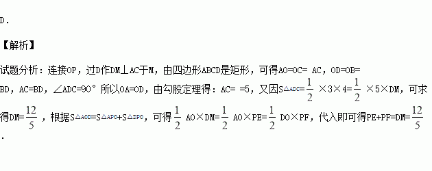 如图 ,在矩形ABCD中,AB=3,AD=4,P是AD上的动点,PE⊥AC于E,PF⊥BD,则PE+PF的值为 ( )