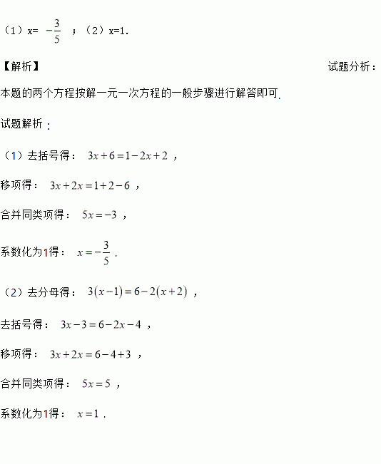 解方程:(1)3(x+2)=1﹣2(x﹣1);(2) .