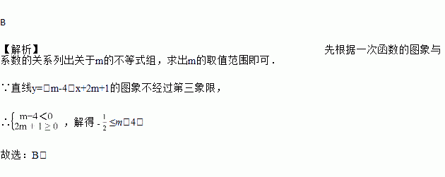 已知一次函数y=(m-4)x+2m+1的图象不经过第三象限,则m的取值范围是( )