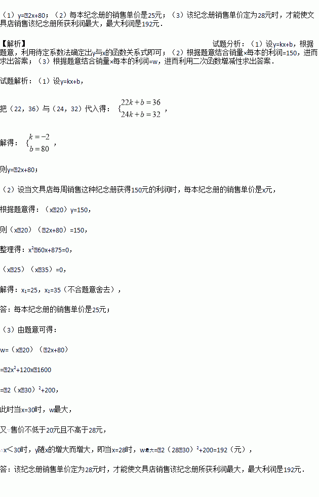(14分) 某文具店购进一批纪念册,每本进价为20元,出于营销考虑,要求每本纪念册的售价不低于20元且不高于28元,在销售过程中发现该纪念册每周的销售量y(本)与每本纪念册的售价x(元)之间满足一次函数关系:当销售单价为22元时,销售量为36本;当销售单价为24元时,销售量为32本.