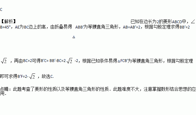 如图,在边长为2的菱形ABCD中,∠B=45°,AE为BC边上的高,将△ABE沿AE所在直线翻折得△AB′E,AB′与CD边交于点F,则B′F的长度为( )