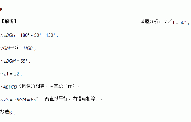 如图,直线EF分别与直线AB,CD相交于点G,H,已知∠1=∠2=50°,GM平分∠HGB交直线CD于点M.则∠3等于( )