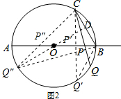 (2)如图2,当点P在直径AB上运动时,CP的延长线与⊙O相交于点Q,试问PB为何值时,△CBQ是等腰三角形?