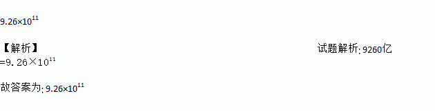 在今年的春节黄金周中,全国零售和餐饮企业实现销售额约9260亿元,比去年春节黄金周增长10.2%,将9260亿用科学记数法表示为_____________.