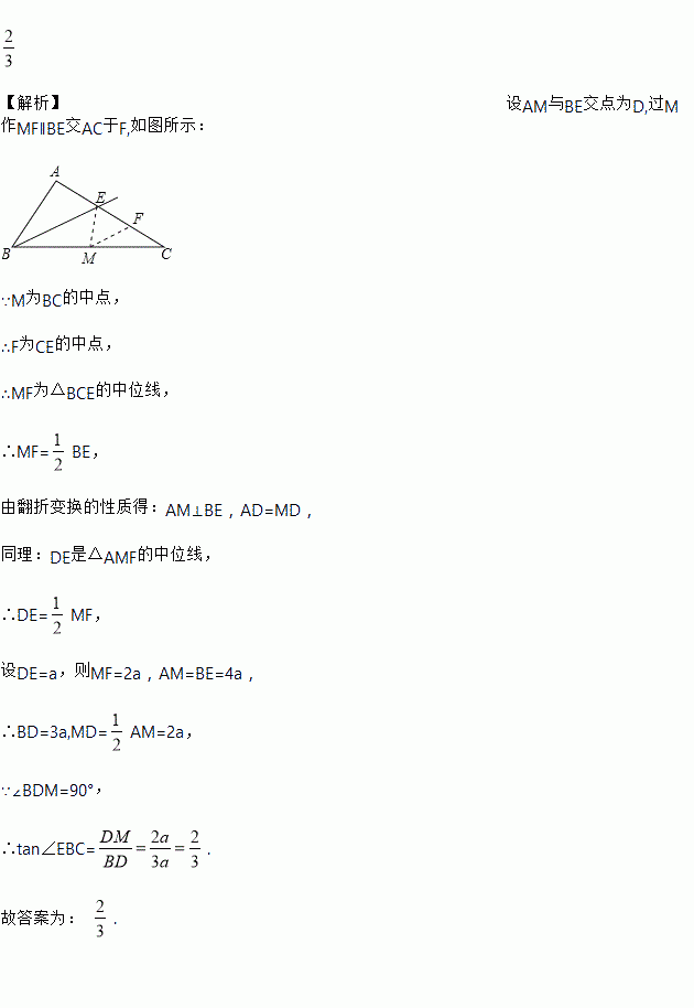 如图,已知△ABC沿角平分线BE所在的直线翻折,点A恰好落在边BC的中点M处,且AM=BE,那么∠EBC的正切值是________