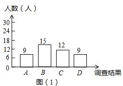 10£®Ã¿ÄêµÄ11ÔÂ9ÈÕÊÇÈ«¹úÏû·ÀÈÕ£¬Ä³Ñ§Ð£ÊýѧÐËȤС×éΪÁ˽âÊÐÃñ¶Ô¸É·ÛÃð»ðÆ÷ʹÓ÷½·¨µÄÖªÏþÇé¿ö£¬Ëæ»ú³éÑùµò²éÁ˲¿·Ö18-65ËêµÄÊÐÃñ£¬²¢½«µ÷²é½á¹û·ÖΪËĸöÀà±ð£ºA£®·Ç³£ÊìϤ£»B£®±È½ÏÊìϤ£»C£®ÖªµÀһЩ£»D£®Ò»ÎÞËùÖª£®¸ÃС×é¸ù¾Ýµ÷²é½á¹û»æÖÆÁËÈçÏÂÁ½·ù²»ÍêÕûµÄͳ¼ÆÍ¼£®Çë¸ù¾ÝͼÖÐÐÅÏ¢½â´ðÏÂÁÐÎÊÌ⣮£¨1£©±»µ÷²éµÄÊÐÃñ×ÜÈËÊýΪ60ÈË£¬Í¼£¨1£©ÖÐmµÄֵΪ15£®