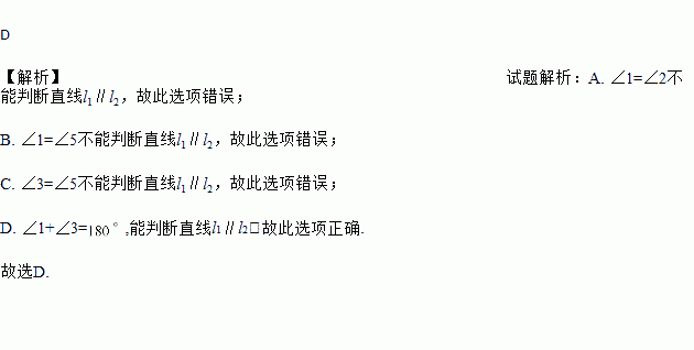 A. ∠1=∠2 B. ∠1=∠5 C. ∠3=∠5 D. ∠1+∠3=180°