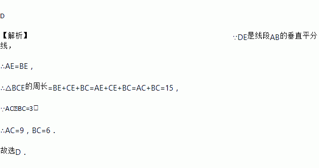 如图,已知AC﹣BC=3,AB的垂直平分线分别交AB、AC于点D、E,△BCE的周长是15,则AC的长为( )