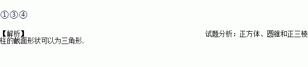 用一个平面去截一个几何体,截面形状为三角形,则这个几何体可能为:①正方体;②圆柱;③圆锥;④正三棱柱 (写出所有正确结果的序号).