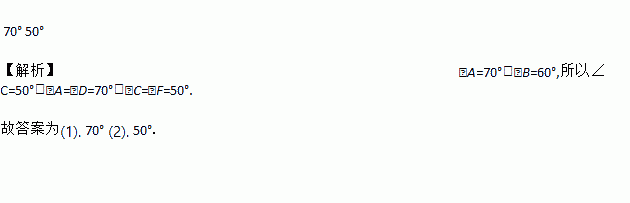 70° 50° 【解析】∠A=70°,∠B=60°,所以∠C=50°,∠A=∠D=70°,∠C=∠F=50°. 故答案为(1). 70° (2). 50°.