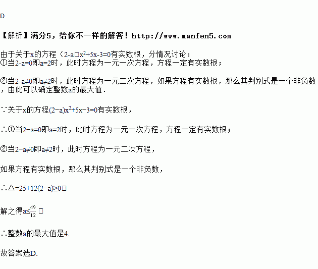 关于x的方程(2-a)x2+5x-3=0有实数解,则整数a的最大值是( )