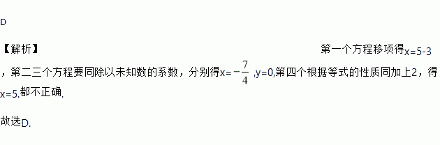 D 【解析】第一个方程移项得x=5-3,第二三个方程要同除以未知数的系数,分别得x=,y=0,第四个根据等式的性质同加上2,得x=5.都不正确. 故选D.