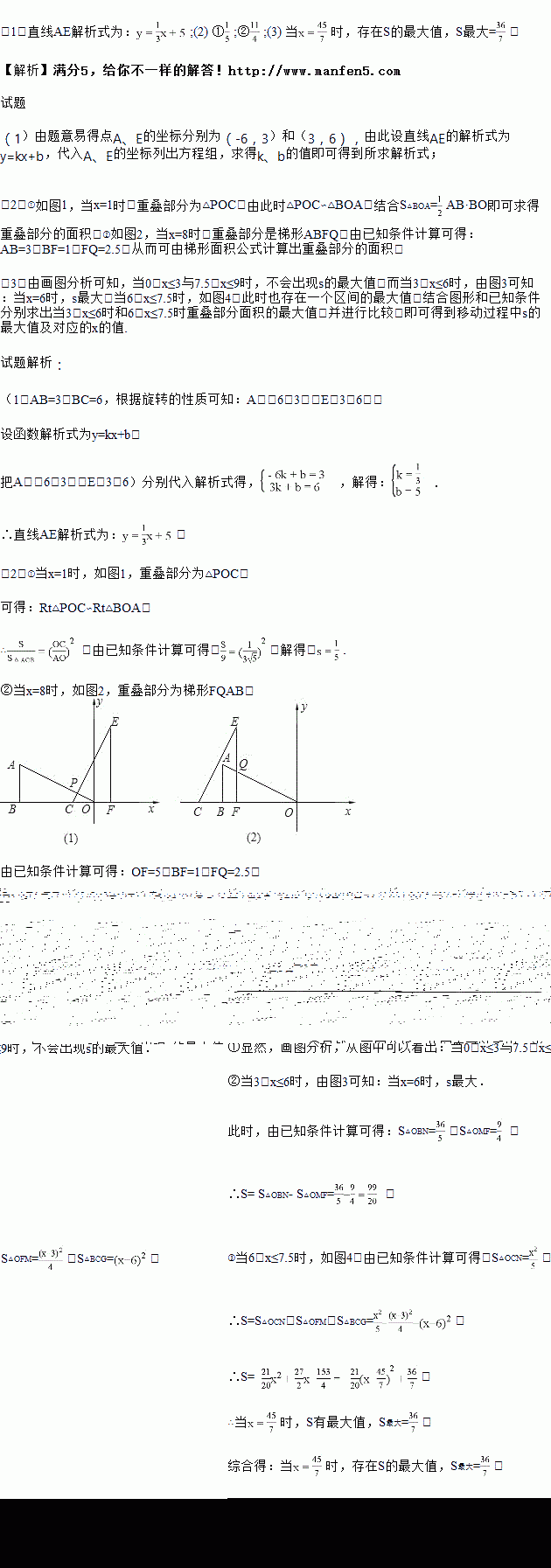 (2)将Rt△EFC沿x轴的负半轴平行移动,如图③.设OC=x(0<x≤9),Rt△EFC与Rt△ABO的重叠部分面积为s;求当x=1与x=8时,s的值;