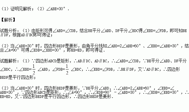 (2)当∠ABE为多少度时,四边形BEDF是菱形?请说明理由.