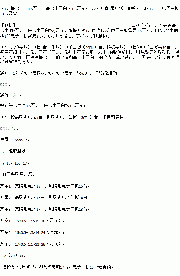 (2)根据学校实际,需购进电脑和电子白板共30台,总费用不超过30万元,但不低于28万元,请你通过计算求出有几种购买方案,哪种方案费用最低.