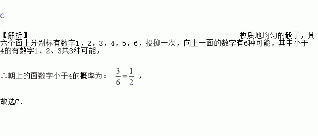 一个质地均匀的骰子,其六面上分别标有数字1,2,3,4,5,6,投掷一次,朝上的面数字小于4的概率为( )