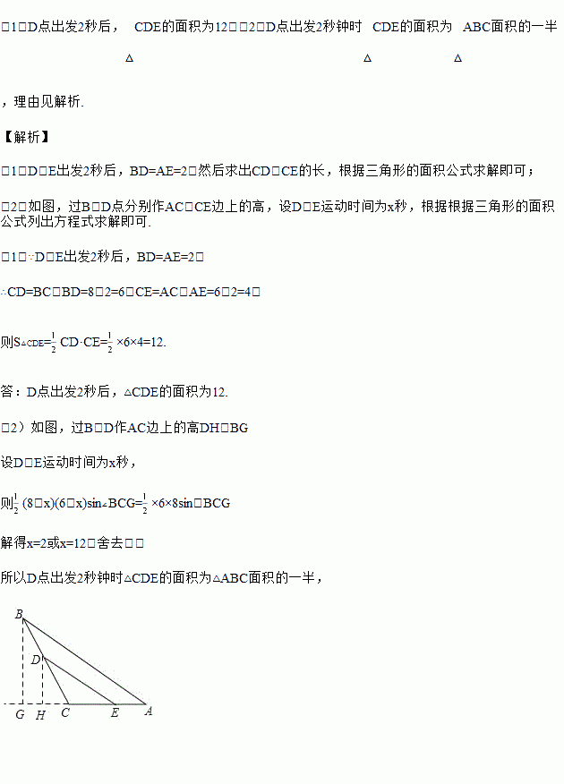 (1)如图1.△ABC中,∠C为直角,AC=6,BC=8,D,E两点分别从B,A开始同时出发,分别沿线段BC,AC向C点匀速运动,到C点后停止,他们的速度都为每秒1个单位,请问D点出发2秒后,△CDE的面积为多少?