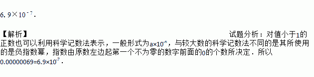 某种电子元件的面积大约为0.00000069平方毫米,将0.00000069这个数用科学记数法表示为______.
