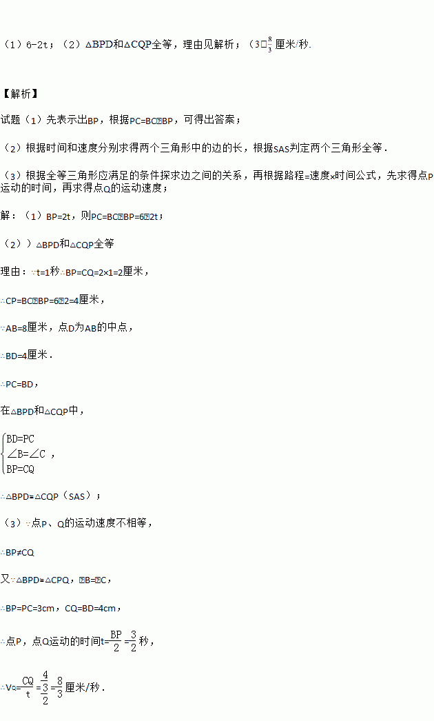 如图,已知△ABC 中,∠B=∠C,AB=8 厘米,BC=6 厘米,点 D 为AB 的中点.如果点 P 在线段 BC 上以每秒 2 厘米的速度由 B 点向 C 点运动, 同时,点 Q 在线段 CA 上以每秒 a 厘米的速度由 C 点向 A 点运动,设运动时间为 t(秒)(0≤t≤3).