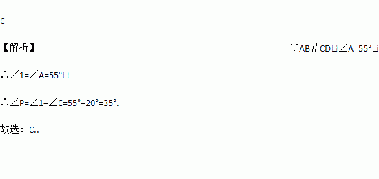 如图所示,已知AB∥CD,∠A=55°,∠C=20°,则∠P的度数是( )