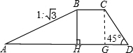 点评:此题考查了学生对坡度坡角的理解及梯形的性质的掌握情况.需注意构造直角三角形是常用的辅助线方法.