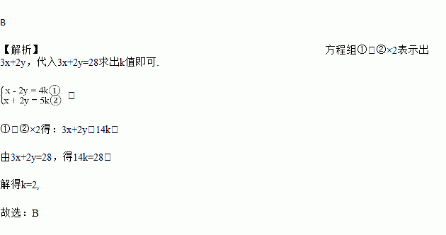 己知关于x,y的方程组的解满足3x+2y=28,则k的值为( ) .
