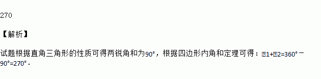 如图,一个直角三角形纸片,剪去直角后,得到一个四边形,则∠1+∠2= .