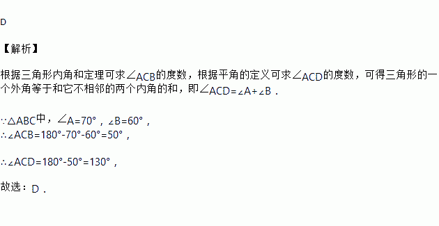 在△ABC中,∠A=70°,∠B=60°,∠ACD是△ABC的一个外角,∠ACD的度数为( )